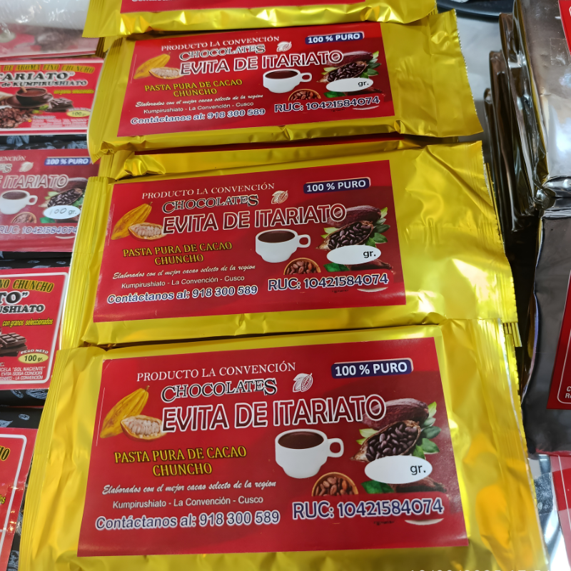 Disfruta la esencia más auténtica del cacao chuncho de La Convención – Cusco, en su forma más pura. Evita de Itariato 100% es un chocolate elaborado exclusivamente con pasta pura de cacao chuncho, sin aditivos ni mezclas, conservando todo el aroma, sabor y propiedades naturales del cacao amazónico.